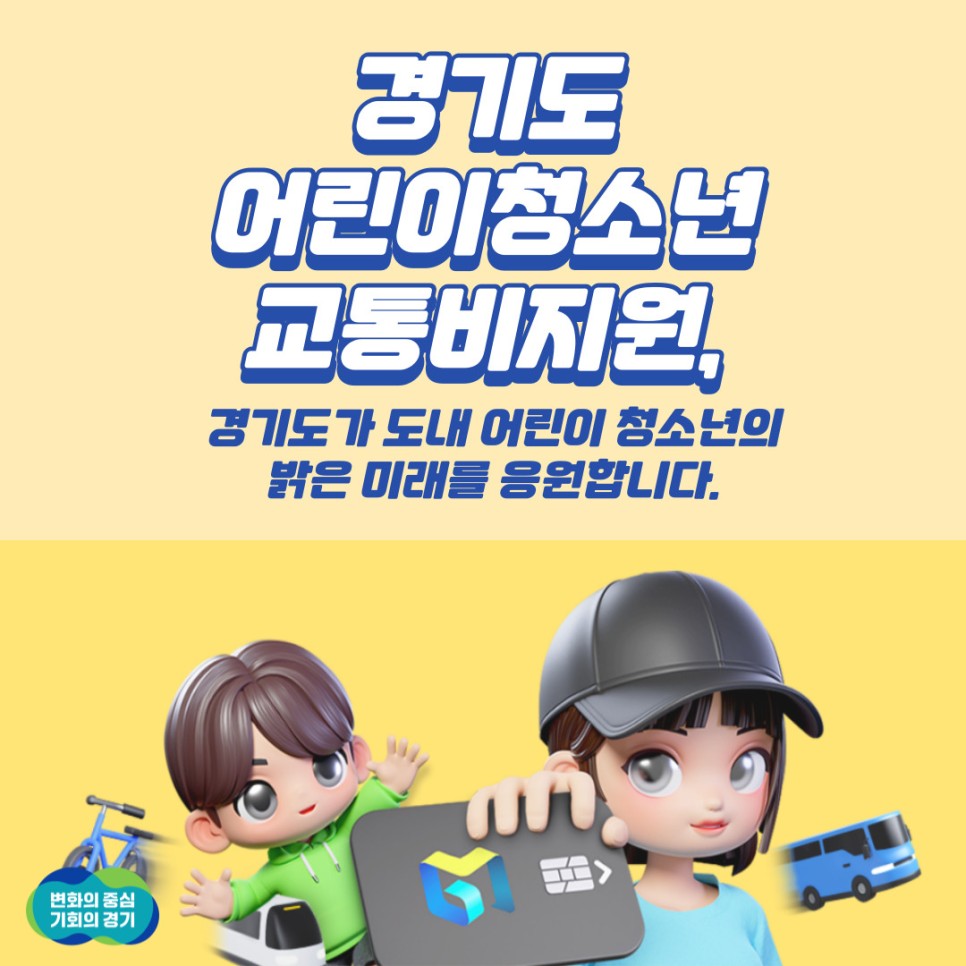 경기도 어린이 교통비 지원사업을 통해학부모님들의 경제적 부담을 줄이고, 아이들이 안전하게 대중교통을 이용할 수 있도록 하자.